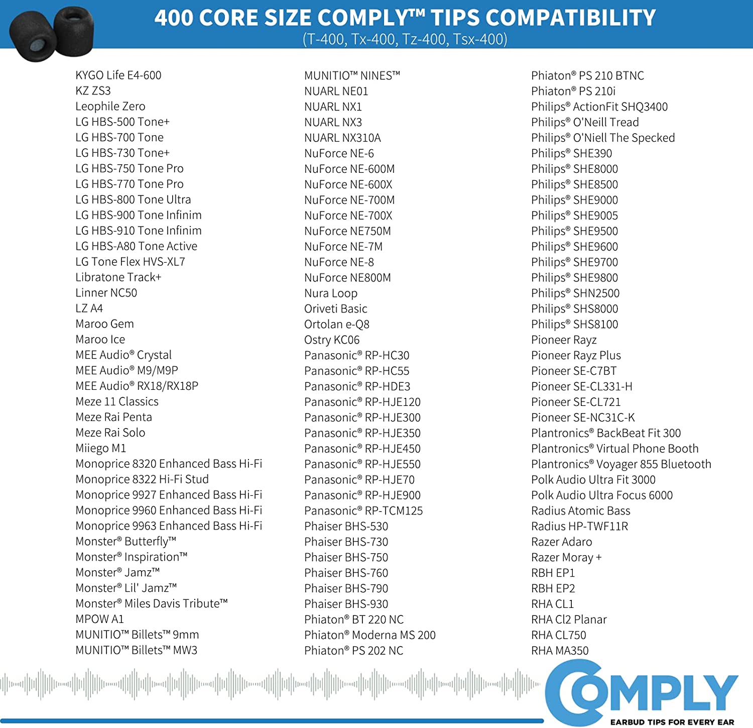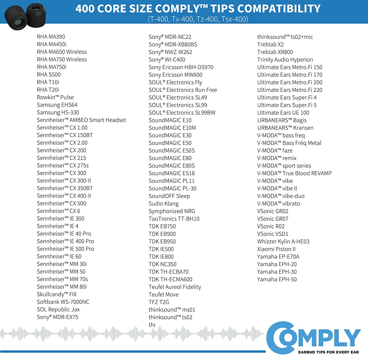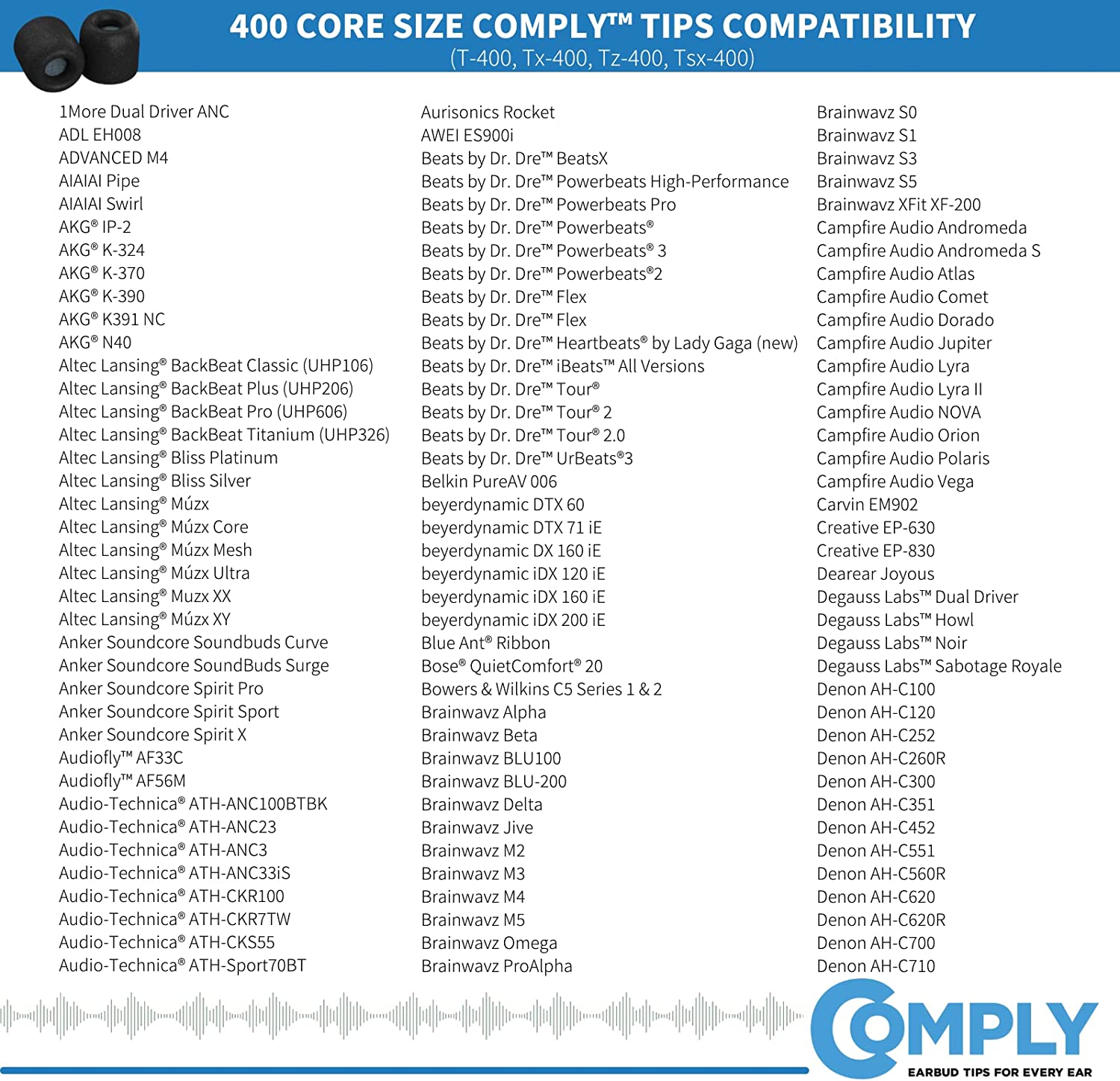 - COMPATIBILITY - 400-Series fits Beats by Dre, Skullcandy, Audio-technica, and more. Multiple core sizes allow you to find the perfect fit for your earphones.Find your compatibility here: Complyfoam.com/Compatibility